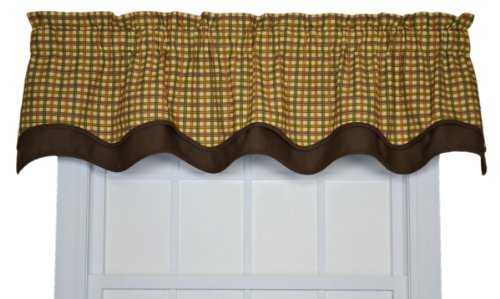 - Double scalloped valance; The top layer is a small scale multi colored check pattern and is accented by a solid color bottom layer with bias binding to add a clean crisp edge