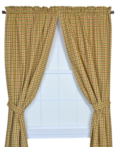 Charlestown small scale multi colored check print tailored pair of drape panels with tiebacks-check print is one of the most popular decorating patterns today. The classic multi colored check print creates an updated look and feel to any room, while the multiple colors are meant to complement and blend with other decorative items in your decor. The soft seven-ounce 100-percent cotton duck fabric creates a softer texture and smoother draping effect that some times can't be achieved with inferior synthetic fabrics. Each curtain is constructed with standard rod pockets, 2-1/2-inch header; 3-inch hems and includes 2 standard tiebacks. Sold in pairs (2 Panels) Length is measured overall 63-inch from header top (ruffle above the rod pocket) to bottom of panel. Width is measured overall 68-inch per pair of panels (both 34-inch panels together) Charlestown tailored panel pair curtains can be combined with a choice of 5 coordinating Charlestown valance top treatments and 2-piece lined swag curtains that are available thru Amazon. Also available are matching tailored tier curtains, valances, lined swag curtains, toss pillows, and shower curtains. Made in the USA, Dry clean onlyYou will not be disappointed with